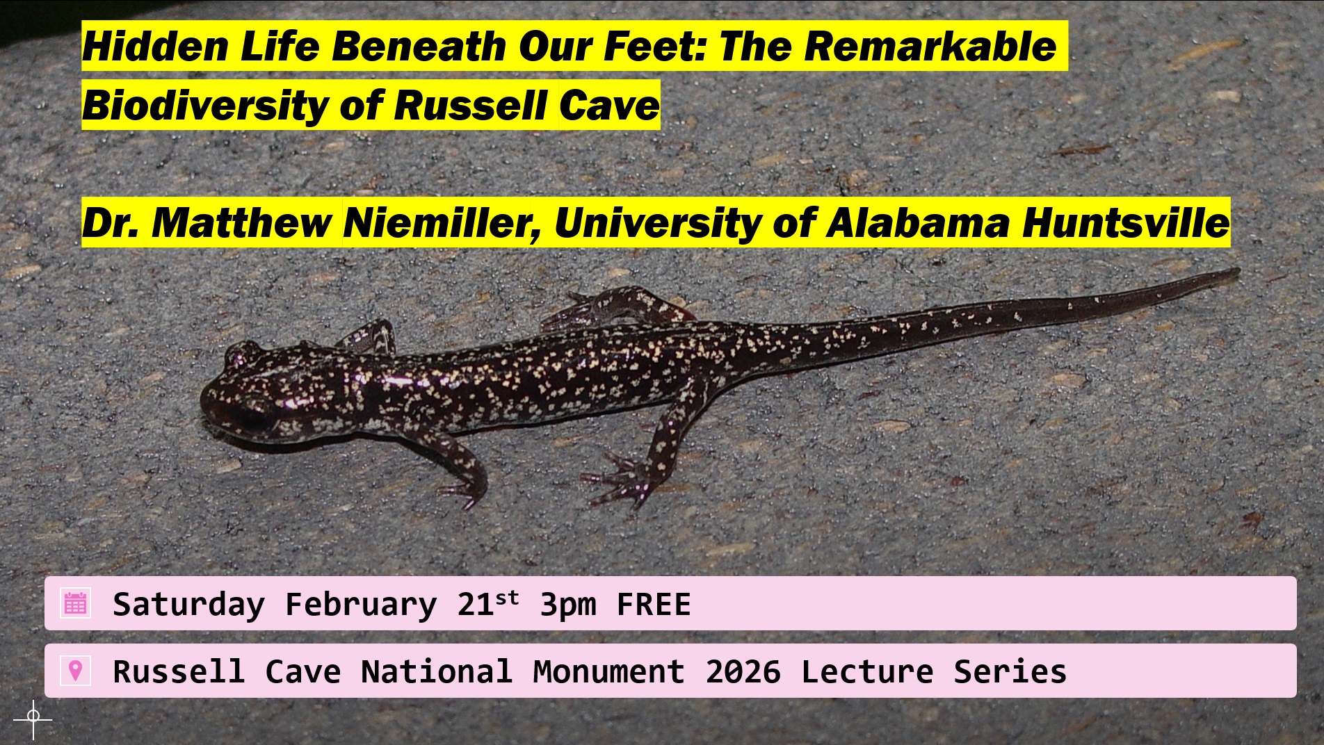 Join us on Saturday, February 21st from 3:00 PM – 4:00 PM for a presentation on the Hidden Life Beneath Our Feet: The Remarkable Biodiversity of Russell Cave. Given by Dr. Matthew Niemiller, University of Alabama Huntsville. This is an indoor FREE event!